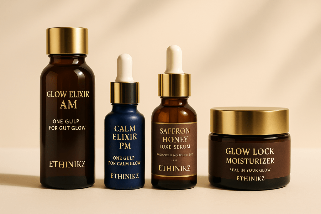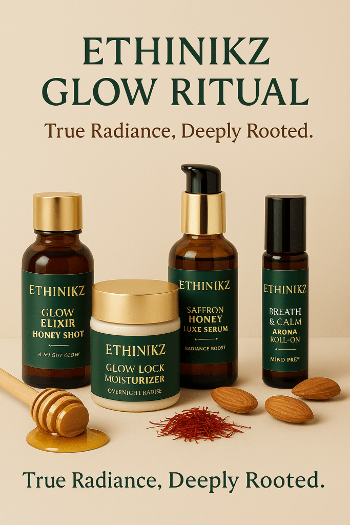 The EthiniKz Glow Ritual is a 5-step holistic skincare system designed by a doctor, blending ancient tradition with modern science. It goes beyond the surface, addressing gut, mind, and skin together for a glow that lasts.